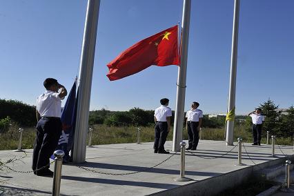 伴隨著廣播介紹大連海事大學(xué)與錦州航星集團(tuán)校企合作的深厚情誼,我們?nèi)嗪图瘓F(tuán)所有員工已經(jīng)整齊的站在了國旗前,等待著國旗升起的莊嚴(yán)時刻。